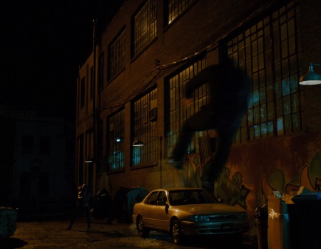El Vengador uses enhanced strength to punch a criminal across the length of an alleyway.