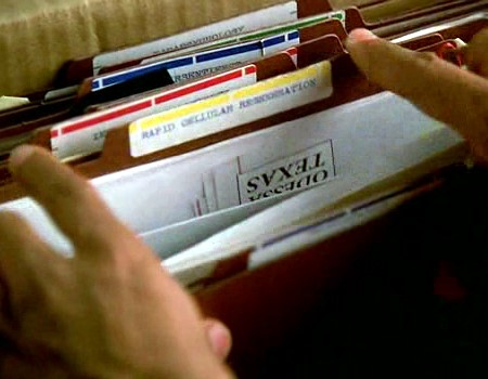 The words "ODESSA TEXAS" are visible in the Genesis file for rapid cell regeneration as Mohinder flips through the files.