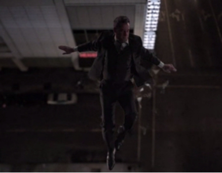 Nathan hovers in the air after being pushed out of a window.