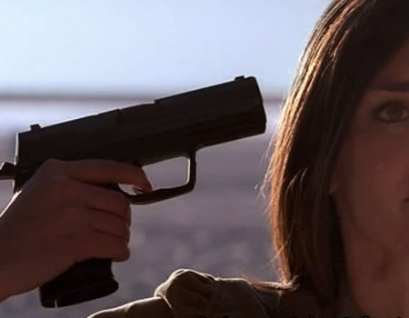 Rachel Mills is forced by Eric Doyle to point her own gun at her head.