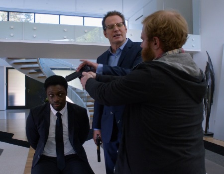 Quentin holds Harris at gunpoint in the Kravids' home.