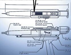 Ted travels to [[Billings, MT]], and forces his way into the [[Pharmatech Industrial Building]]. Inside a room stockpiled with the weapon, Ted is confronted by a [[Pharmatech scientist]] who wields one at him in. Ted takes control and demands information about the hypo gun. The scientist tells Ted that the gun is used to inject wild animals with a radioactive isotope that allows them to be tracked. Ted, infuriated, [[radiation|burns down]] the building. |
