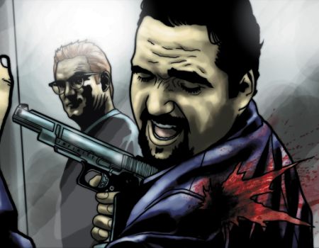 A [[Level 5 agent]] wields an Infinity-branded gun as he is shot by [[Sabine]]. |