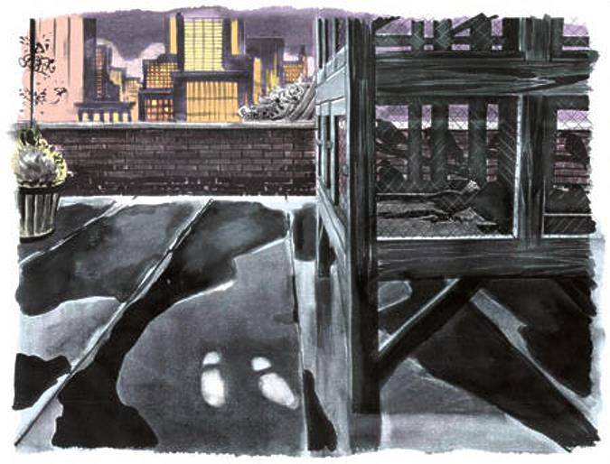 [[Isaac Mendez]] paints the footprints of an [[invisible]] figure on [[Charles Deveaux's rooftop]]. |