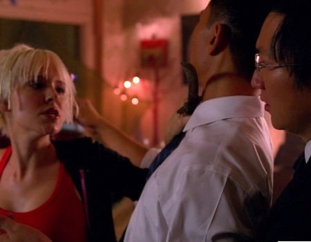 Ando is stuck between Daphne's super speed and Hiro's time stopping.