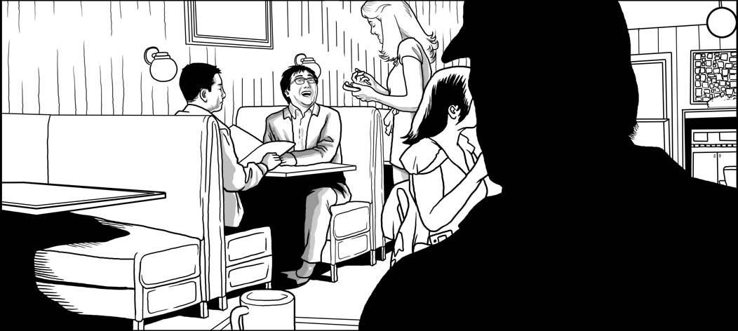 Jason Badower draws the details of Hiro, Ando, and Charlie at the Burnt Toast Diner for Road Kill.