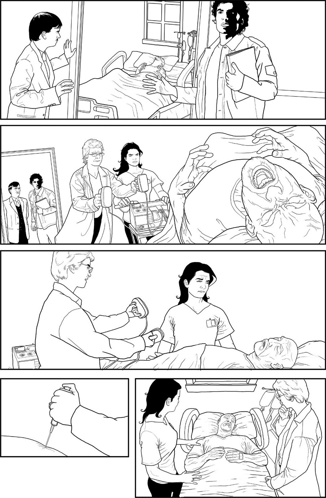 Jason Badower draws page two of Blackout, Part 1 in black and white.