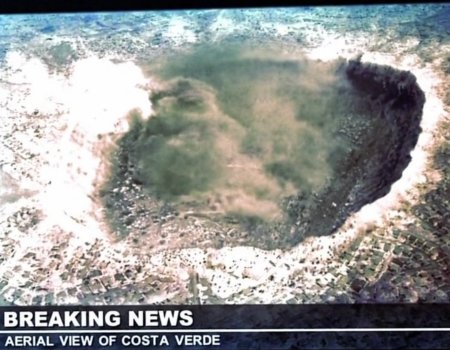Sylar's radioactive explosion creates a crater where Costa Verde once existed..