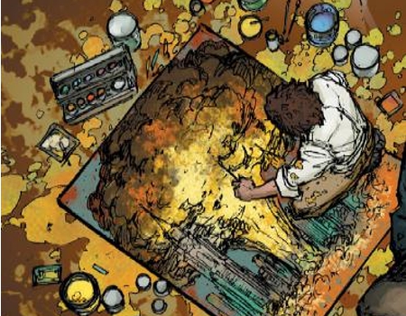 Isaac creates a mural of the explosion on the floor of his apartment.