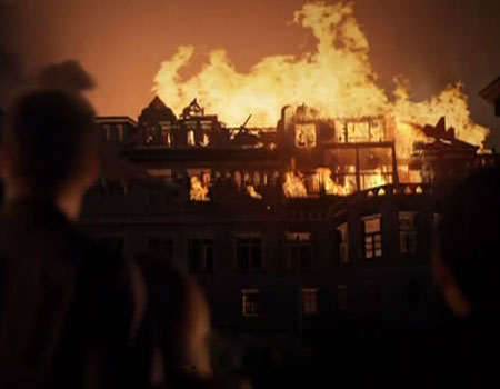 After Rosie had picked him up and flown him away, he had let out a hige burst of fire from his feet, which spiralled downwards and lit the school on fire. |