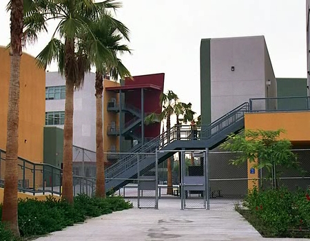Costa Verde High School is a brightly-colored, industrial looking complex.