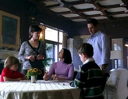 The Petrelli Family deliberate about campaign postcards in the family room of their home.