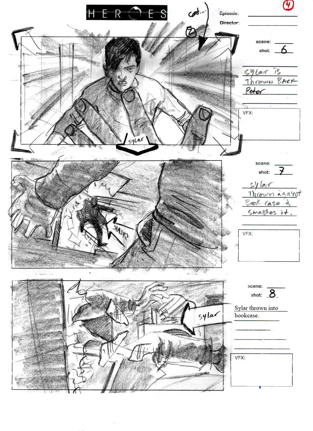 Cesar Lemus storyboard page 4 of the scene in which Peter and Sylar fight in Mohinder's apartment.