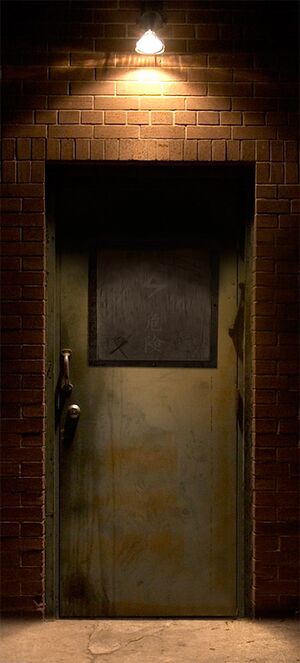 So I'm sitting in my office at Yamagato, reading up on my favorite sci-fi movie from 1963, when a drop of water splashes on my keyboard. The air conditioner vent is leaking again, so I go down to the basement to talk to maintenance, but no one's in the office. So I start poking around - this place is huge! Curiously, there's a little puddle on the floor, so I follow it looking for the source. Lo and behold, I find a battered, dirty door hidden away behind a bank of filing cabinets with this symbol on it: