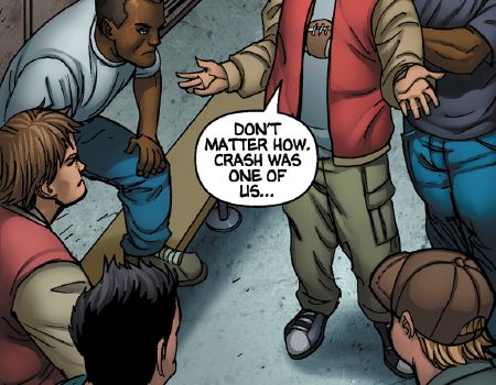 Some of Betty's high school's football team gather together to discuss the rumor that Ren caused Crash's insanity.