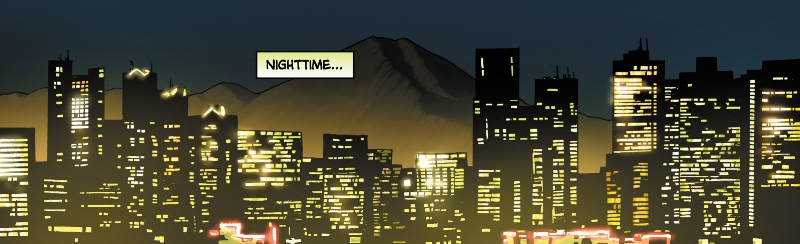 Kimiko works late as the Tokyo skyline darkens.