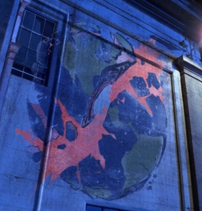 One of Usutu's paintings of the Earth splitting in two appears on a building at a Hudson River pier.