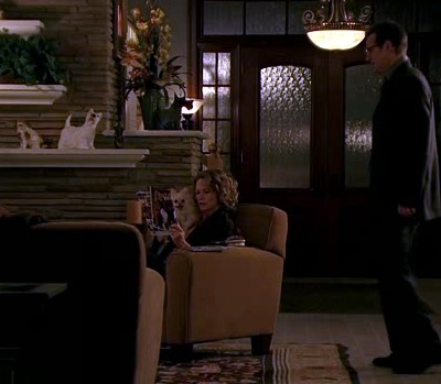 Sandra and Mr. Bennet in the living room at the Bennets' home.