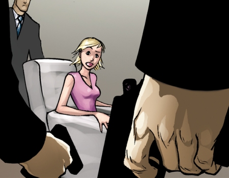 Graphic novel screenshot for Our Lady of Blessed Acceleration, Part 2. Daphne gets threatened.