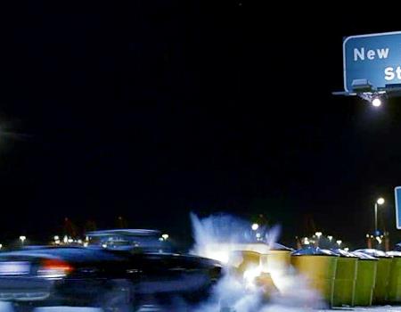 Nathan Petrelli's sports car hits a construction barrier, seriously injuring Heidi Petrelli