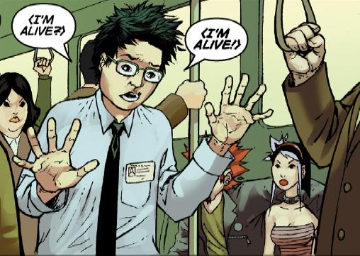 After teleporting onto a Tokyo subway, Hiro is happy to be alive.