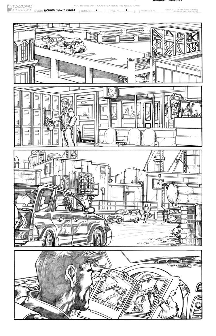 Robert Atkins draws the line art for a page of Trust Issues, Part 1.
