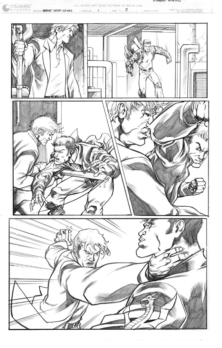 Robert Atkins draws the line art for a page of Trust Issues, Part 1.