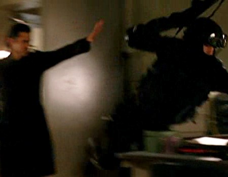 Peter Petrelli telekinetically hurls a Homeland Security guard aside.