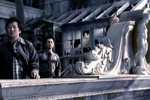 Hiro and Ando stand atop Charles Deveaux's rooftop in a Explosion Future.