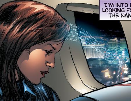 While flying to Las Vegas on a Stateside plane, Hana hacks into Linderman's server.