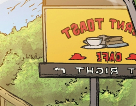 Noah passes a Burnt Toast Cafe when driving between Washington and Coyote Sands.
