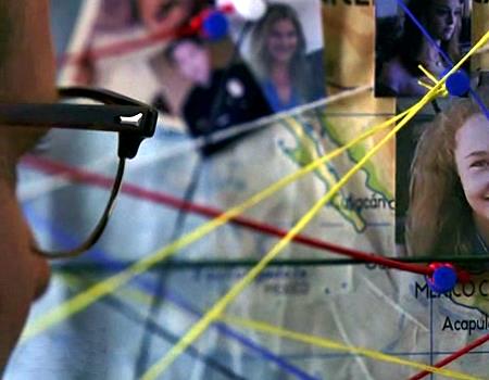 Mr. Bennet examines photos of Matt, Niki, Charlie, and Claire which Chandra Suresh has pinned to the map