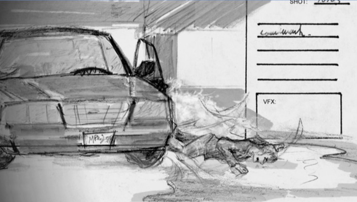 A storyboard for the scene in Orientation when Noah is trapped in his car by incoming water