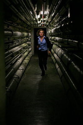 Audrey chases Sylar to a utility room in the L.A. FBI Headquarters.
