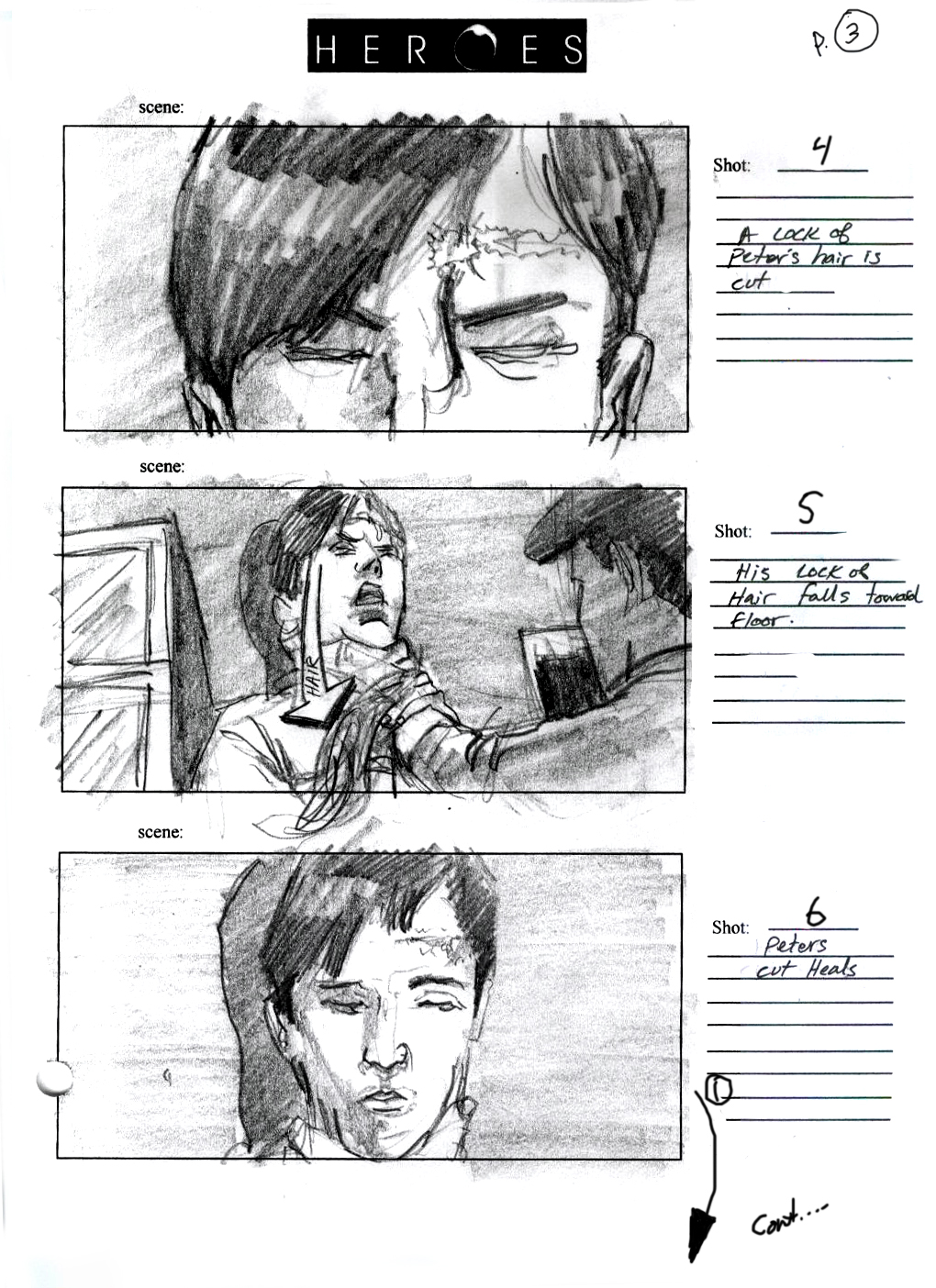 Cesar Lemus storyboard page 3 of the scene in which Peter and Sylar fight in Mohinder's apartment.