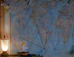 Originally seen in Chandra Suresh's Madras apartment, the map was recreated in Brooklyn by his son Mohinder using photographs and Eden McCain's recollections of her conversations with Dr. Suresh. The pair later discovered a much more complete version of the map in Sylar's residence in Queens, but the map later disappeared, along with all the other contents of that apartment. Sylar's more complete version included many data points missing from the original, several with photographs of individuals which had been marked with the Symbol, among them a newspaper clipping of Nathan Petrelli.