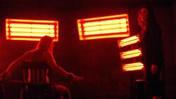 Tracy is held in a cell with heat lamps, after being captured by Homeland Security.