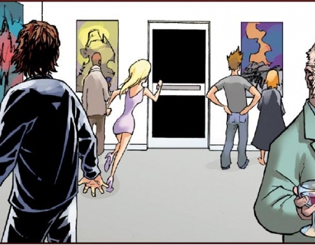 A woman, upset at one of Isaac's paintings, runs out of the Deveaux Gallery.