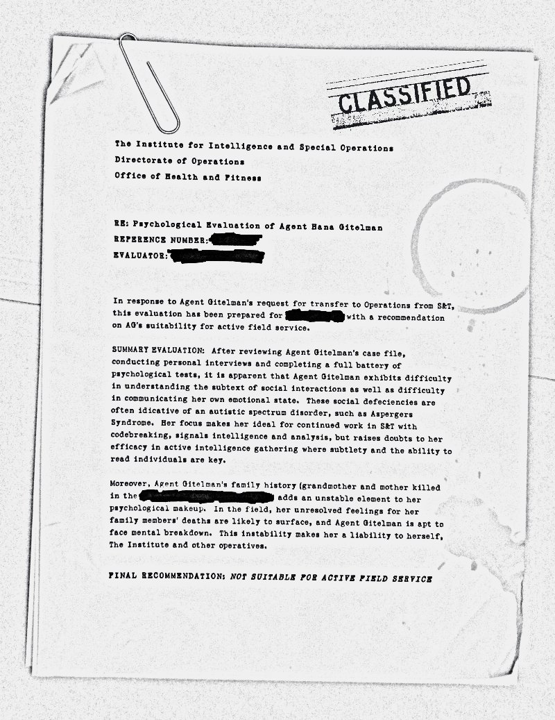 Hana's data file at primatechpaper.com contains a psychological evaluation from Mossad.