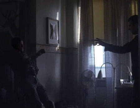 Sylar uses telekinesis to tilt agent Daniel Simmons and then levitate him.