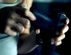 In the elevator of Ridgway Jewelry, Jessica readies her gun. After catching up with Matt Parkman and Aron Malsky, she fires a few shots at them, but misses. Matt manages to sneak up behind her in the stairwell, and tells her to drop her gun over the railing, which she does.