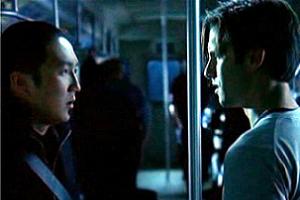Future Hiro gives Peter Petrelli the message on a subway train while time is frozen.
