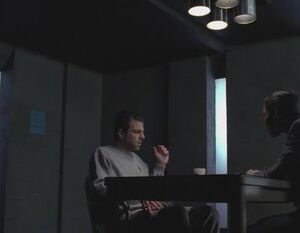 Lubbock enters the interrogation room and tells Sylar to put his hands flat on the table. He explains that he sent Madeline home and they've confirmed that Sylar is Gabriel Gray, a watchmaker from New York who killed his mother. Lubbock unplugs the camera and says he's going to get a confession of how Sylar killed his mother. Sylar insists that he wouldn't have killed anyone. When Lubbock comes at him and threatens violence, Sylar raises his hands in a defensive move and sends him telekinetically flying through the two-way mirror, and then stares at his hands in shock.
