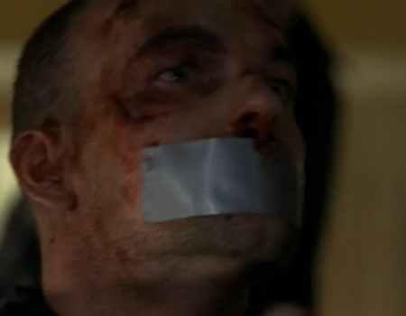 Agent Daniel Simmons is severely bruised and beaten by Sylar, and is tied up in the home of Mary and Luke Campbell.