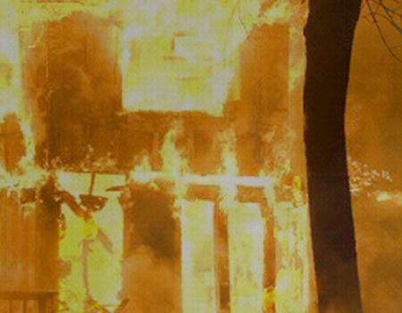 After Sam and his squad are killed in an explosion, the front of the biological warfare compound is depicted as being on fire.