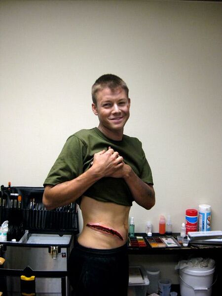 Cristina Waltz shows off the the makeup work she did on the gash in Cole Williams's side.