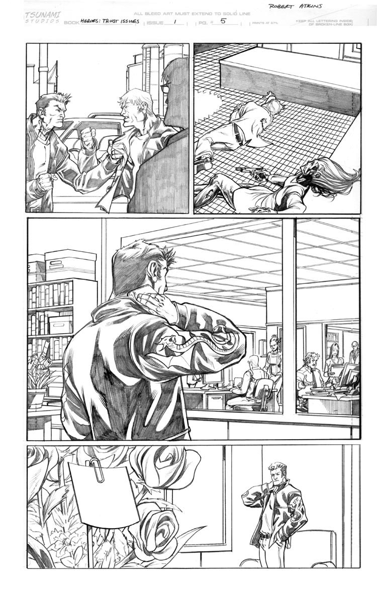 Robert Atkins draws the line art for a page of Trust Issues, Part 1.