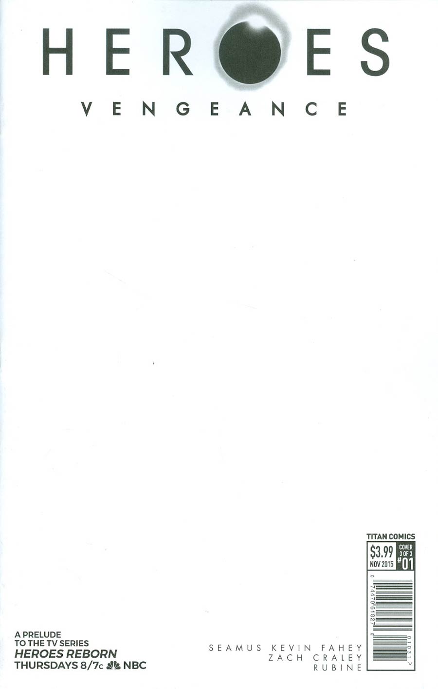 As for the covers, the red and white one (currently second in the HeroesWiki article, created by Paul Pope) was only used for an ashcan comic from San Diego Comic Con 2015 (not for Issue #01). The ashcan comic includes six pages from Vengeance #01 in black and white (like the three in the "Previews" section), as well as the "A Brave New World" article from the first issue of Heroes Reborn: Event Series — The Official Magazine. About the magazine, the ashcan also reveals that "Issue One hits stores on September 29, and Issue Two on December 1."