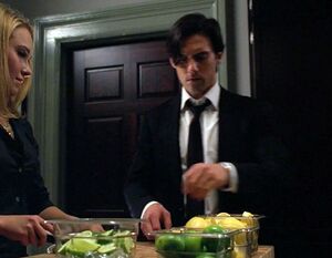 Angela goes over to talk to Peter. He says that it couldn't have been easy for her to cover things up with Noah. Peter says that he's doing okay, but she doesn't believe it. He snaps at her briefly and then admits that he wants to express his anger. She figures that he wants revenge on Sylar, but warns against it, saying that she can't bear to lose him, too. Claire comes in and Peter goes to embrace her, asking her to come with him to the kitchen. He sends the caterers out and closes the door so that they can have a break. As he and Claire cut up lemons and limes, Peter notes that Noah isn't there and Claire says that she told him not to come, admitting that she's pissed off. Peter says that he is as well, but figures Angela and Noah were just trying to protect them. Angry, Claire slips and cuts her finger, which does not heal. Peter apologizes, remembering he currently has the Haitian's ability to neutralize powers. He offers to turn it off, but Claire tells him not to so she can experience the pain again. She talks about how they are there to remember Nathan and how Nathan gave her grief for dating West, a guy who could fly. As they talk, Claire admits it feels nice to share stories about Nathan and asks if he has any. Peter chooses not to respond and goes back to the wake.