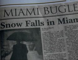 While discussing Adam Monroe, Bob shows Nathan a November 21, 2006, Miami Bugle article entitled Snow Falls in Miami. The article relates a light snowfall which had just occurred in Central Florida to other snowfalls, including one that occurred in Miami (South Florida) on January 19, 1977. Bob notes to Nathan that this event could have been a tsunami that would have wiped out the Eastern seaboard of the United States instead.